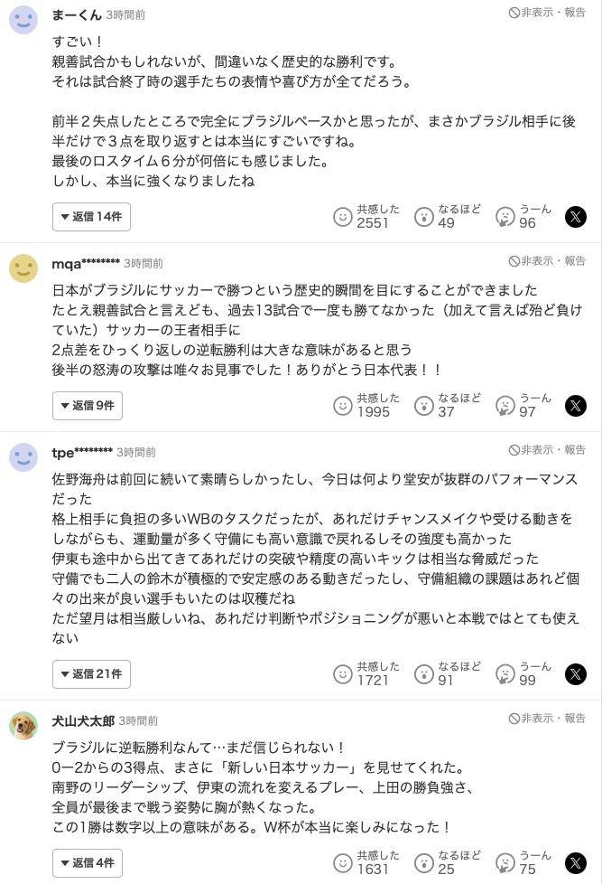 另外一位球迷写道:巴西队虽然不算是全主力,可是小日子队的三笘薰、远藤航、板仓滉、守田英正、伊藤洋辉、富安健洋也没参赛啊,因此我们也不能算是优质阵容,大家就放肆庆祝吧!这几年小日子队赢了德国队、西班牙队、巴西队,已经足够说明问题,不管外界怎么说,可是小日子队如今确实有冲击世界杯冠军的实力,2026年的美加墨,向着夺冠的目标冲刺吧!