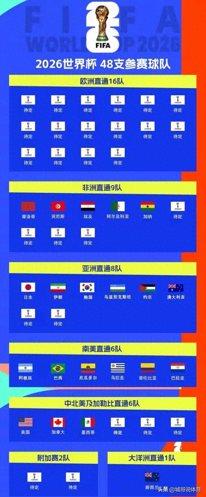 令人无奈的就是,亚洲直通的队伍当中,国足未上榜,亚洲直通有8队,分别为小日子、泡菜国、伊朗、乌兹别克斯坦、约旦、澳大利亚。还有2支队伍待定中。国足会有希望吗?
