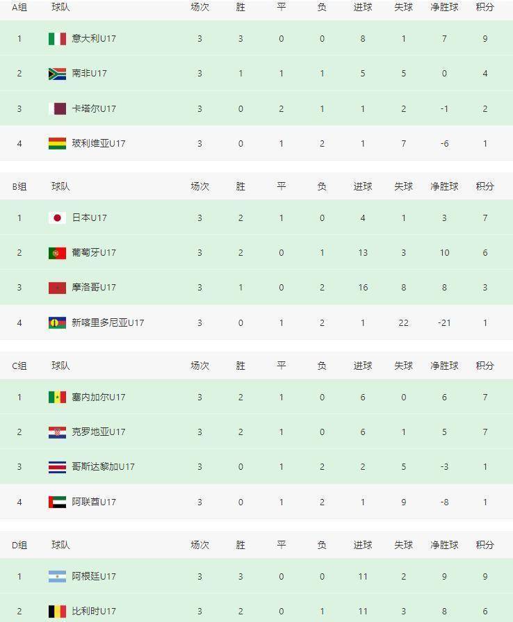 B组最终积分榜上,日本队2胜1平积7分反超葡萄牙夺得小组第一,葡萄牙2胜1负积6分排名第二,摩洛哥1胜2负积3分排名第三,新喀里多尼亚1平2负积1分垫底。 日本和葡萄牙携手晋级32强淘汰赛。
