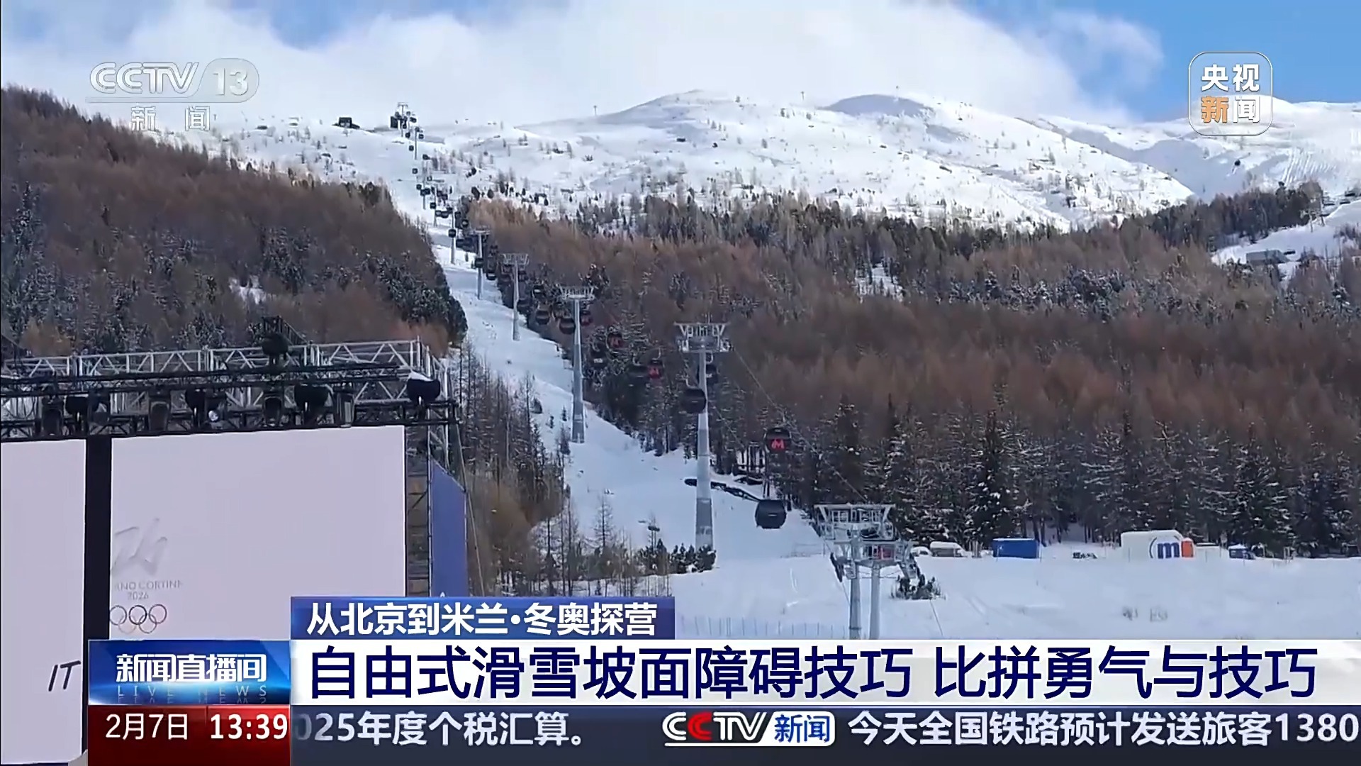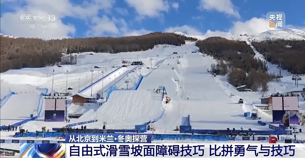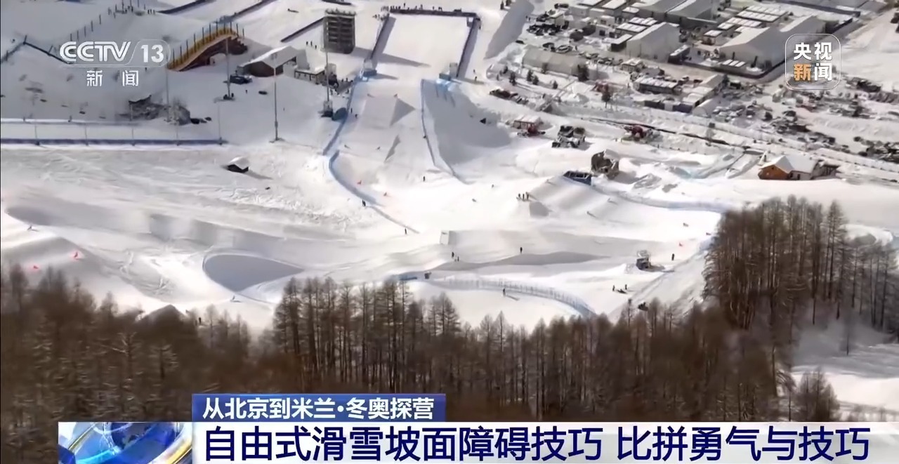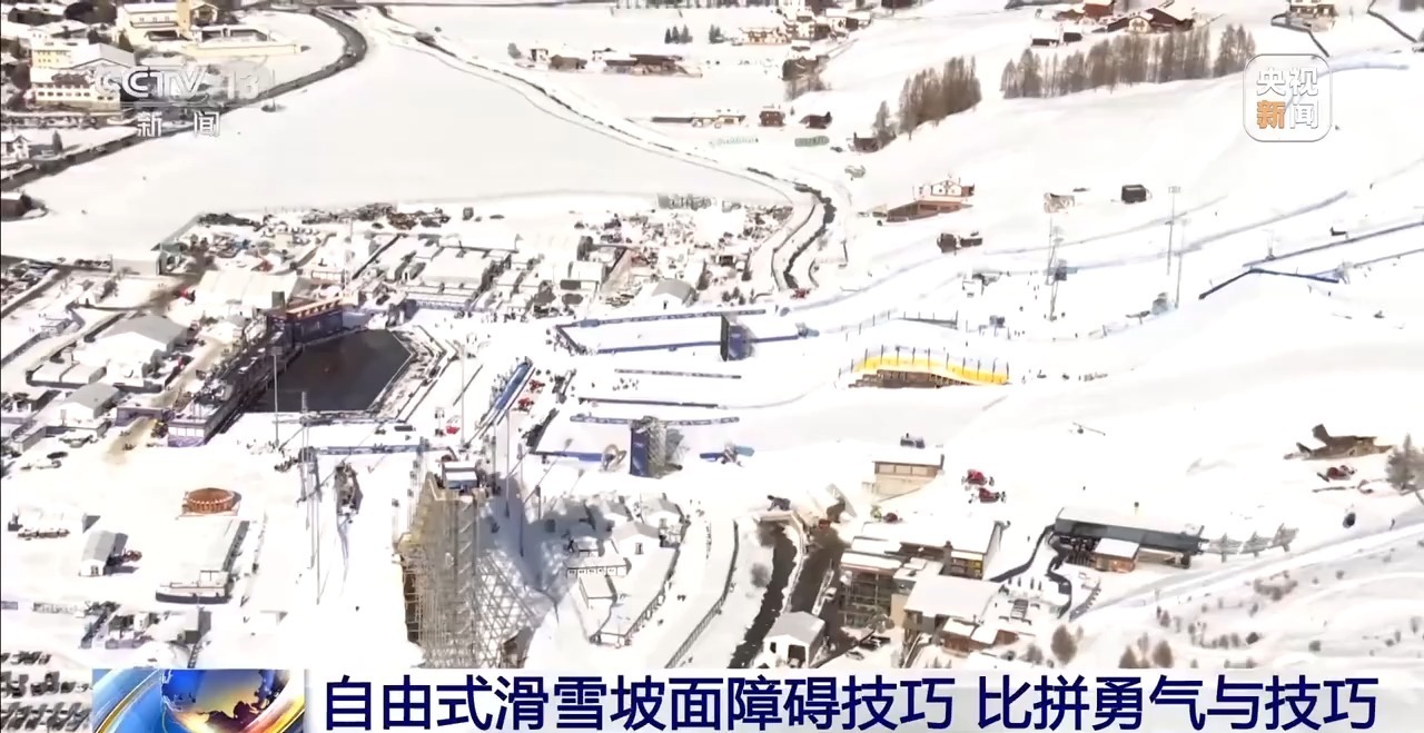 这里是利维尼奥雪上公园,也就是米兰冬奥会滑雪类公园项目的比赛场地。在这片不大的区域中,五个场地依次排开。其中,处在中间位置的就是坡面障碍技巧场地。据了解,这个场地在比赛开赛的前几天才刚刚塑形完毕,赛道由多个连续的滑行结构组成,一共是包括了三个障碍区和三个跳台区。