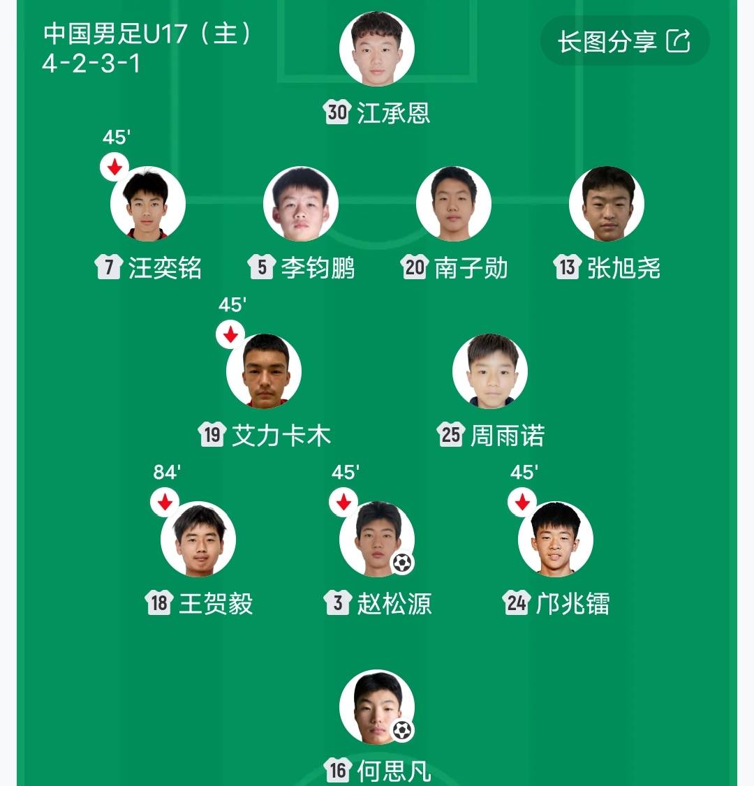 1,U17国少首场7球血洗印尼U17,派出了接近主力阵容,只是在欧洲留洋万项和谢晋没有参加这次集训。另外主力后腰徐正鹏坐在替补席,他只是在下半场最后阶段替补出场,下图是中国U17国少7球横扫印尼U17主力阵容。