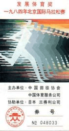 1984年10月14日,中国田径协会在北京举办第四届国际马拉松赛。为筹集资金,中国田径协会和中国体育服务公司于当年10月10日共同在北京发行了发展体育奖———1984年北京国际马拉松赛奖券,引发了购买热潮。仅北京工人体育馆一处发行点,当时就涌来约6000位购买者,售券处前排起了长队。